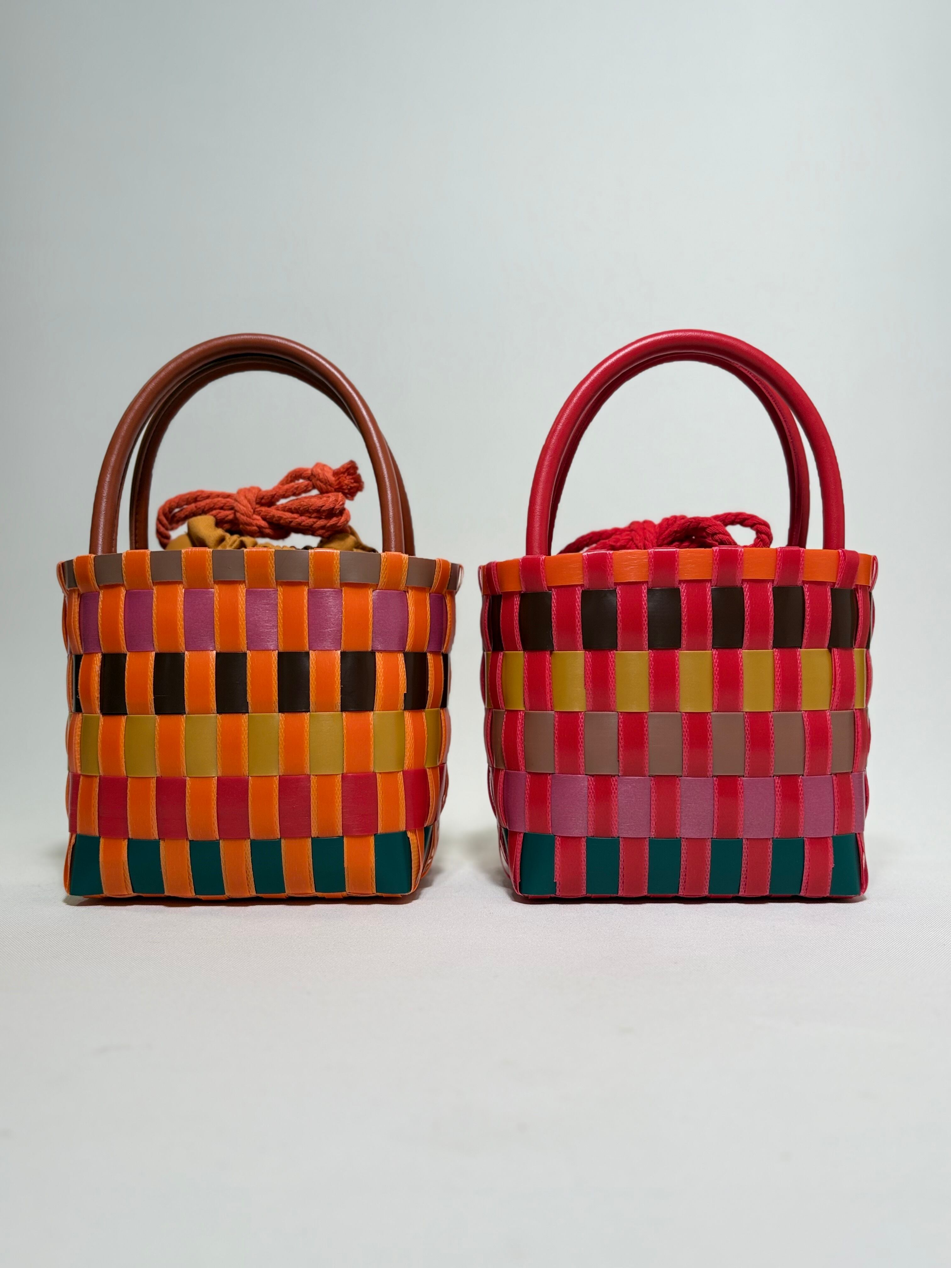 タイ製バンド赤色を重ねて編み込むことによりツヤ感がでて上品なバッグになります。